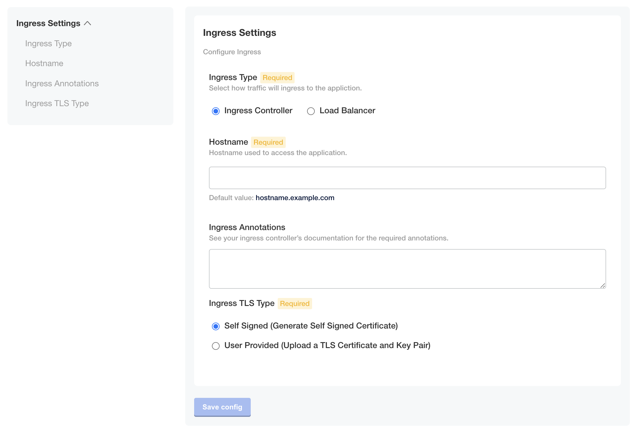 As shown in the image below, the configuration fields that are specific to the ingress controller display only when the user selects the ingress controller option and KOTS is not running in a kURL cluster: